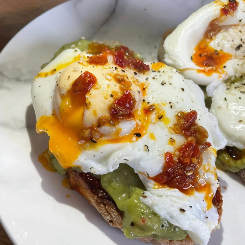 So tasty 🤤 topped with some free range poached eggs and @rishrightuk Qin chilli oil 👌 really makes the poached eggs taste so good 😊