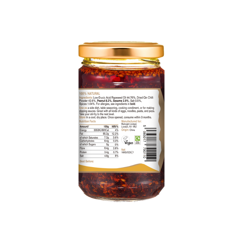 Ingredient: Dried Qin-Chilli Powder 46%, Low-erucic acid Rapeseed Oil 44.76%, Peanut 8.2%, Sesame 2.9%, Salt 0.5%, Spices 1.04%.